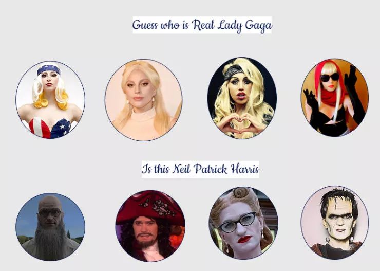如下图所示,伪装包括有意和无意的改变面容来混淆自己的身份,或者模仿别人的身份。你能猜出下面谁是 Lady Gaga,谁是 Neil Patrick Haris 吗?