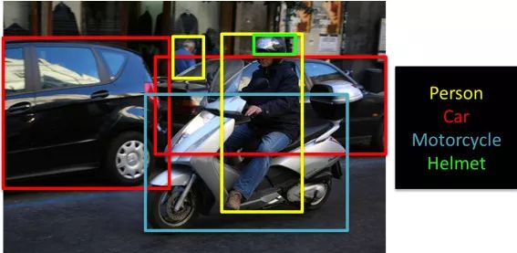 在第二个例子中,有若干物体:汽车、人、摩托车和头盔。
