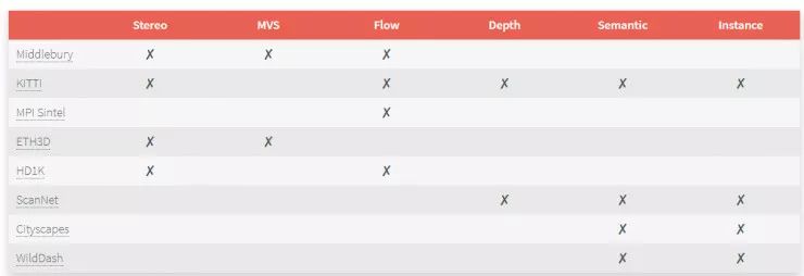 有了公共排行榜,大家只需要比较多种方法的结果,就很容易追踪到这一领域的最先进技术。虽然目前在每个数据集上都取得了稳定的进展,但许多都只限于特定领域。例如,KITTI 专注于真实世界的城市驾驶场景,而 Middlebury 考虑的是室内场景。
