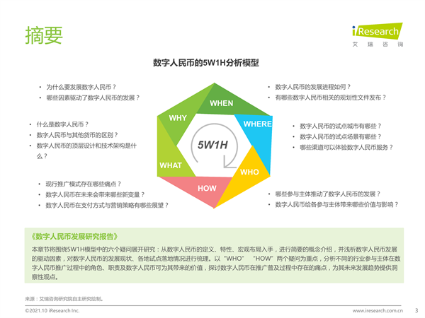 《2021年中国数字人民币发展研究报告》围绕5W1H模型中的六个疑问展开研究:从数字人民币的定义、特性、宏观布局入手,进行简要的概念介绍,并浅析数字人民币发展的驱动因素,对数字人民币的发展现状、各地试点落地情况进行梳理。以“WHO” “HOW”两个疑问为重点,分析不同的行业参与主体在数字人民币推广过程中的角色、职责及数字人民币可为其带来的价值,探讨数字人民币在推广普及过程中存在的痛点,为其未来发展趋势提供洞察性观点。