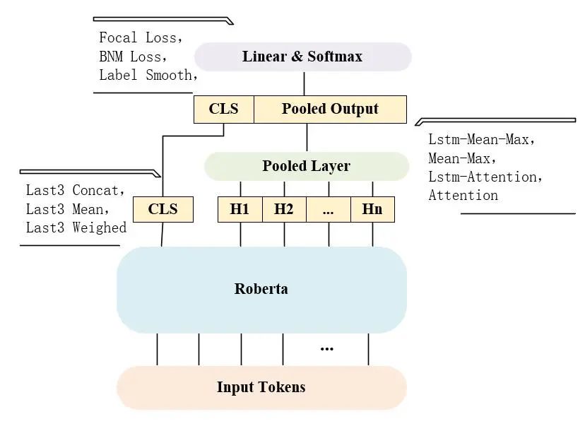 Roberta 最终输出的 CLS,我们尝试过将其替换为最后三层网络 CLS 的 concat、mean 以及 weighted,而在最后的 linear & softmax 层,我们也尝 试过 focal loss、bnm loss 以及 label smooth,但模型性能均未提升,所以在 这两部分我们最终采用了默认的 CLS,以及基础的 cross-entropy 损失函数。