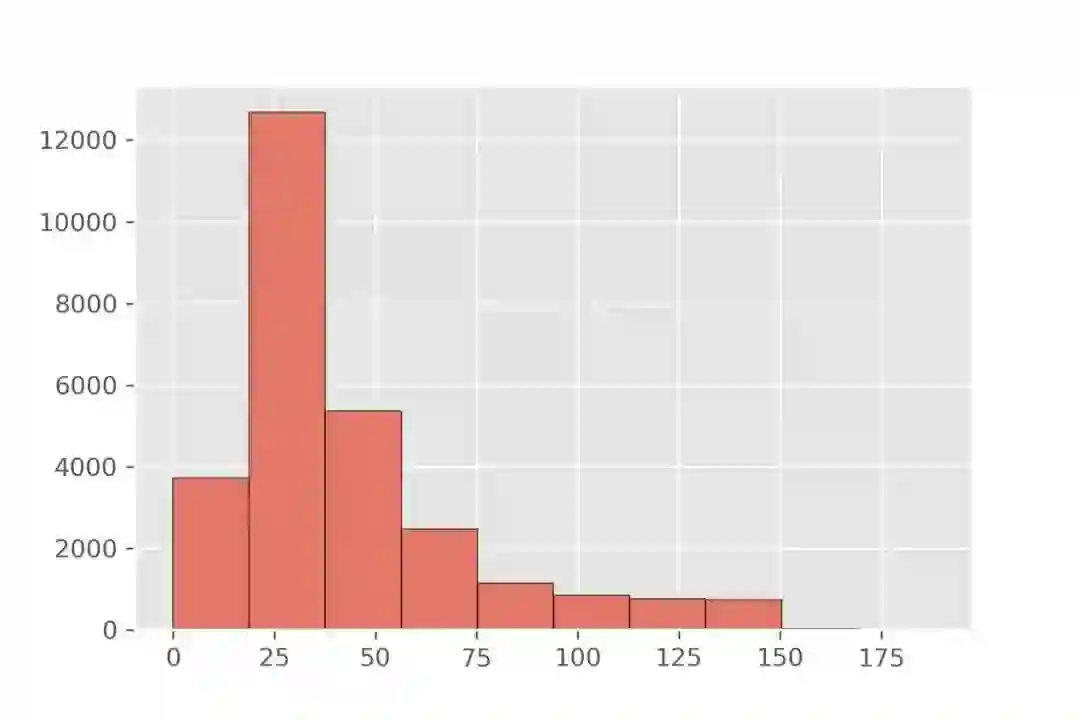 首先分析文本的长度,如图所示,大部分数据长度在 200 字符以内,95%的样本长度在 128 字符以内,99%的样本长度在 192 字符,其中有少量的样本长度达到 1000 以上,我们对多余部分使用截断处理。