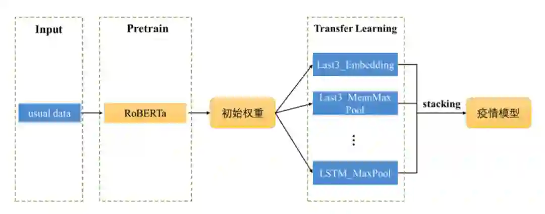 本文模型结构主要对 RoBERTa 以及 BERT 模型进行改进,使用迁移学习将通 用微博中获取的信息迁移到疫情微博中,将多个模型利用 Stacking 进行集成, 在疫情微博上取得了较好的结果。