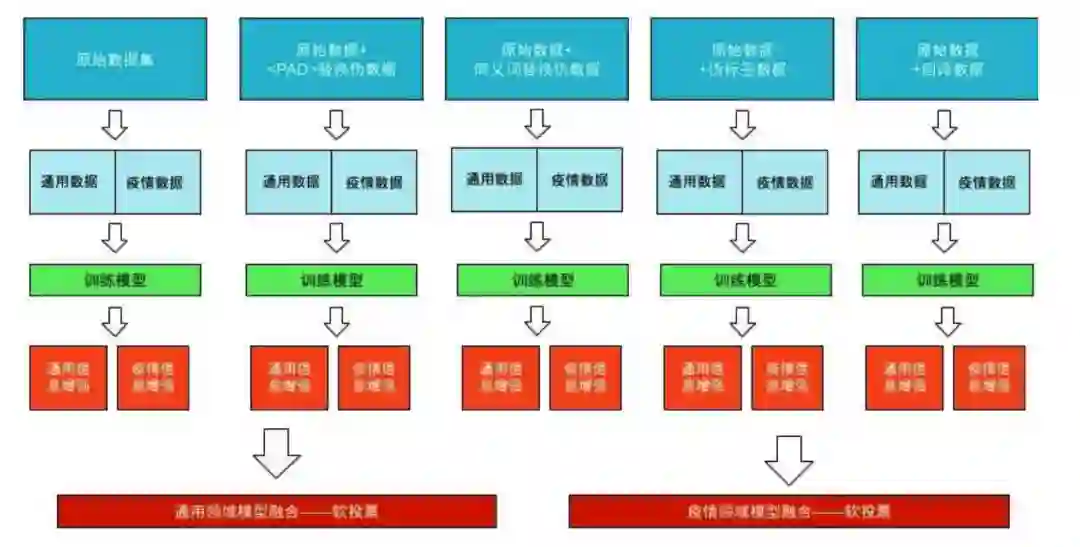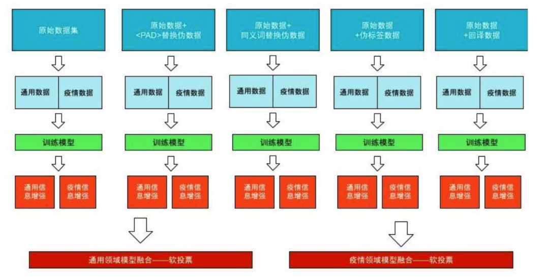 我们分别训练了五个基于不同数据的 RoBERTa_WWM_Ext 模型,再分别对 每个模型进行通用领域信息/疫情领域信息增强后,将增强后的五个通用领域的模型进行软投票融合预测通用领域的数据,增强后的五个疫情领域的模型进行软 投票融合预测疫情领域的数据。