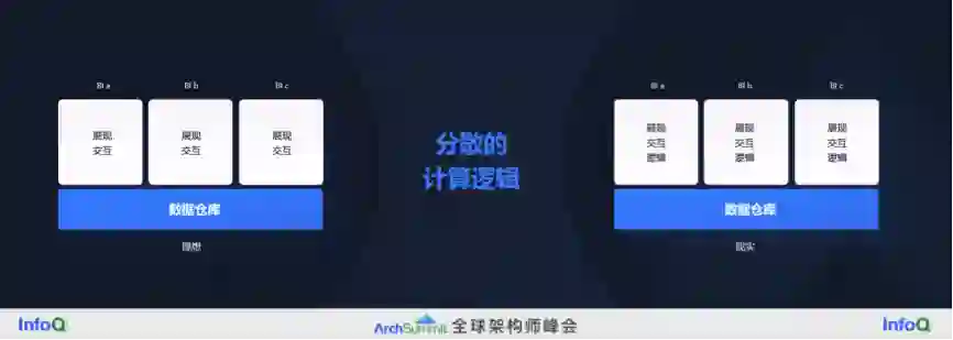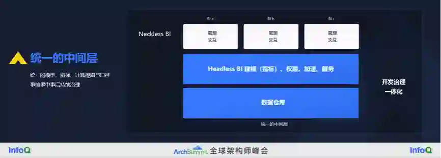 最终,我们希望会产生这样一个统一的中间层,包括数据仓库和 HeadlessBI 两层,后者能做建模,包括指标,做权限、加速和服务,同时把开发和治理一体化了,没有单独的数据开发和数据治理相关的模块。所以它的目标就是通过统一的模型指标计算逻辑和口径,实现事前事中事后的持续治理。这个时候 BI 层才可以真正的聚焦在展现和交付上,这一层 BI 我命名为 NecklessBI,底下的 HeadlessBI 是无头 BI,上面是只有头没有脖子的 BI。