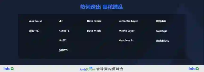 现在数据分析领域相关的概念,有很多而且很杂,经过 30 年的发展,可能又进入到一个比较混乱的状态。比如说我日常最关注的一些概念,Lakehouse(湖仓一体),刚刚看到它在 InfoQ 技术采用生命周期已经进入晚期大众阶段。Data Fabric、Data Mesh 被列在最左边的早期采用者阶。有一些厂商死活跟一个词过不去,叫 ELT,并且产生了一系列的跟它相关的词。有的说我们不做 ETL 了,要做 ELT;有的说我做 AutoETL,甚至有的宣传我可以 NoETL;还有反向 ETL,就是把数仓里面分析的结果又灌到业务系统里面去。