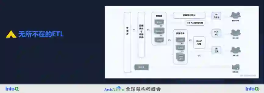 第二个话题是统一的中间层。一提到中间层我们就想到 ETL,现在很多人想灭掉它。这张图来自从蚂蚁金服出来创业的 Aloudata 团队,原来大家设想数据从数据源经过 ETL 进入到数仓再到 BI,但实际上如同这张图所画,ETL 环节是无所不在的。