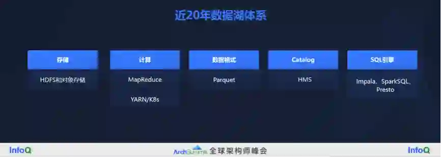 最近 20 年,方法论的创新不是特别多,但是技术体系的进步非常大。有一个技术底座上很大的进步,就是大数据或者说数据湖的一套体系,分为几个主要模块,在最底层是低成本的分布式存储技术,包括在私有环境下部署的 HDFS 文件系统,在云端主要是对象存储。在计算层发展了 MapReduce 框架,包括 Spark 也还是在 MapReduce 框架之内,在调度层有 YARN 和 K8s。非常核心的一点是这个行业形成了一个标准并且开放的数据格式,最典型的代表就是 Parquet,它既可以表达结构化的数据,也可以有效表达半结构化的数据,比如 JSON 这种嵌套式的结构,也可以转化成 Parquet 格式。所有的上层应用都会和 Parquet 格式衔接,所以在这之上又形成了像 Hive MetaStore(HMS)这样的体系规范 Catalog,还有优秀的 SQL 引擎,像 Impala、SparkSQL、Presto。