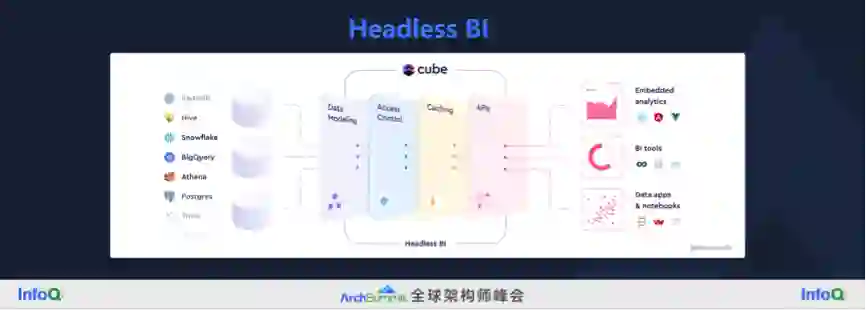 国际方案里面最贴切的描述是 HeadlessBI,我引用了其中一个产品叫 Cube,下图来自 Cube 官网,数据输入来自左边的各种数仓,它在 HeadlessBI 这一层要做的是数据建模、安全相关的访问控制、性能加速,最后以 API 的方式提供给右边的下游消费者,主要是 BI 工具,以及一些数据产品中内嵌的展示,也就是嵌入式的分析。