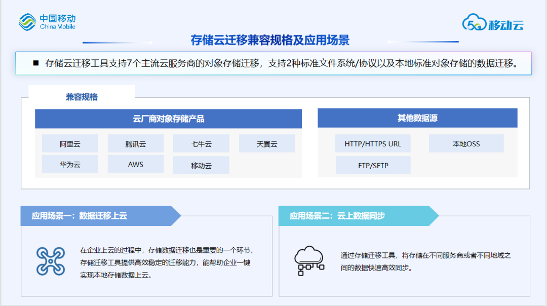 目前存储云迁移工具支持7个主流云服务商的对象存储迁移,支持2种标准文件系统/协议以及本地标准对象存储的数据迁移。目前支持阿里云、腾讯云、七牛云,天翼云、华为云、AWS、移动云的对象存储,同时还支持HTTP/HTTPS地址、本地OSS以及FTP/SFTP数据源。这里给大家说明一下存储云迁移的应用场景: