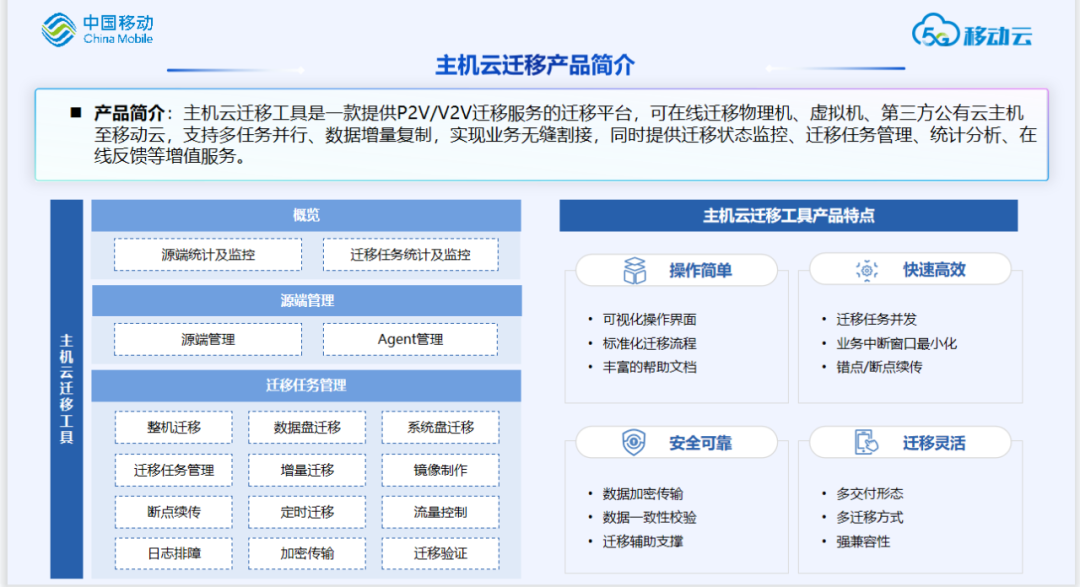 主机云迁移工具是一款提供P2V/V2V迁移服务的迁移平台,可在线迁移物理机、虚拟机、第三方公有云主机至移动云云主机,支持多任务并行、数据增量复制,同时提供迁移状态监控、迁移任务管理、统计分析、在线反馈等增值服务。