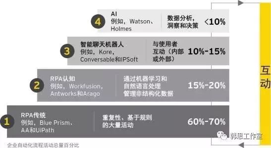 §“RPA可以定义为AI,机器学习等认知技术在业务自动化中的灵活使用,可以是针对重复性工作的自动化以及高度智能处理的自动化。RPA是数字化的支持性工具,可以替代在此之前认为只有人类才可以完成的工作,或者在高强度的工作中作为人工的补充,是企业组织中出现的新概念劳动力。”-毕马威KPMG