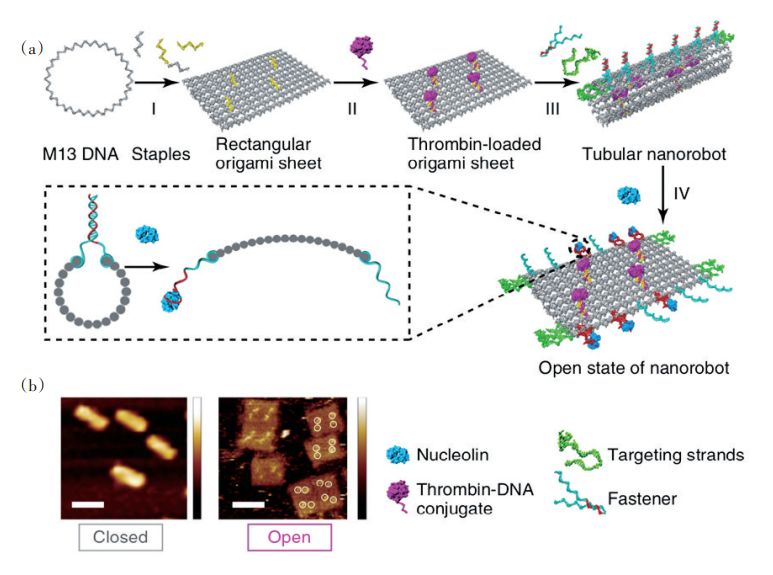 基因疗法旨在将特定基因导入患者细胞中,以纠正或补偿异常基因并可表达特定蛋白,达到治疗的目的,避免化疗所引起系统性毒性并克服耐受性。基因疗法的发展在很大程度上依赖于纳米递送技术,金纳米粒、聚合物纳米粒及脂质纳米粒等是基因递送的主要载体,能有效地递送小分子核酸,防止其在胞外被核酸酶降解,并可改善药物分布。例如,CRISPR-Cas9是一种通过 DNA剪切技术治疗多种疾病的基因疗法,但是递送效率差制约了该技术的有效应用。Jiang等报道了一种多功能的脂质包裹的金纳米粒载体递送Cas9-sgPlk-1质粒用于肿瘤治疗,金纳米粒内核既能够递送质粒,又具有光热响应增强释放能力,有效提高了基因递送的效率。此外,DNA 还可以直接用于构建纳米载体。Ju等报道了一种基于核酸适体sgc8c 和sgc4f 的双受体介导的 siRNA 递送系统,形成双锁的结构,实现了低毒、高效的siRNA运载与特异性基因沉默,成功抑制了肿瘤生长。Zhao 等设计了自组装 DNA“纳米机器人”递送凝血酶(图 5)。通过将凝血酶包裹在内部空腔,隔绝外界底物,使其处于非活性状态。当到达肿瘤相关血管时,DNA 纳米机器上的适配体识别标志物并产生结构变化,使整个 DNA纳米机器从管状结构转变为平面结构,暴露出凝血酶进而诱导栓塞,实现有效包载和智能递送。