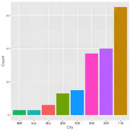 接着先根据省份、城市进行数据的分组和聚合,选择排名前二十的,利用ggplot2包画出如下的城市分布图: