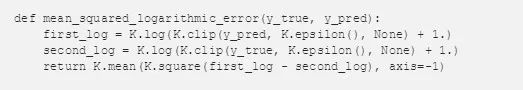 第二个函数计算日志错误的平方,与内置函数类似。主要区别在于我使用的是激活函数 relu 而不是 clip,并且对于特定的住房数据集,我进行价格缩放操作。