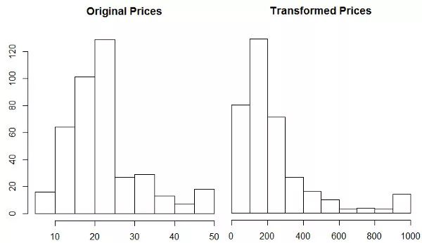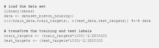 该数据集包括 20 世纪 70 年代波士顿郊区的房价。每个记录有 13 个属性对家庭进行描述,训练数据集中有 404 条记录,测试数据集中有 102 条记录。在 R 中,可以按如下方式加载数据集: dataset_boston_housing()。价格分布直方图显示在下面的左边,其中价格分布从 5 千美元到五万美元不等。原始数据集中不同的价格区间有相似的需求,因此自定义损失函数可能对拟合该数据太大用处。右侧的直方图显示有受益于使用自定义丢失的标签转换。右侧的直方图展示了经过标签转换之后的直方图,将损失函数运用到这些标签上将会获得更好地效果。