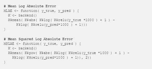 我们将探讨的两个自定义损失函数在下面的 R 代码段中定义。第一个函数,mean log absolute error(MLAE),计算预测值和实际值的对数变换之间的差值,然后对计算结果进行平均。与上面的内置函数不同,这种方法不能纠正错误。与上述对数函数的另一个区别是,该函数将显式比例的因子应用到数据当中,将房屋价格转换回原始值(5,000 至 50,0000)而不是(5,50)。这是有用的,因为它减少了+1 对预测值和实际值的影响。
