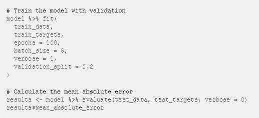 最后一步是拟合模型,然后评估性能。我使用了 100 个批次并且每个批次大小为 5,按照 20%的比例将分割出来的数据作为验证集。在模型训练完训练集之后,模型的性能通过测试数据集上的平均绝对误差来评估。
