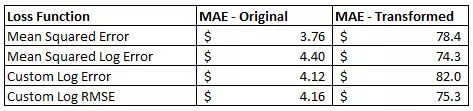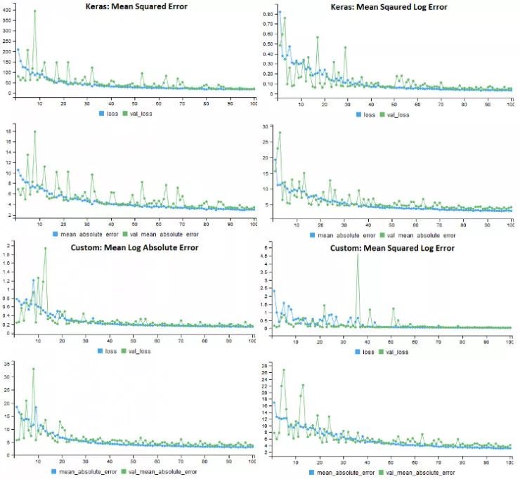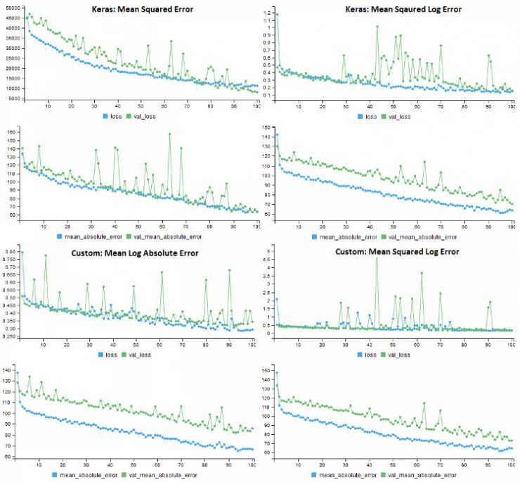 下面显示了转换数据集上四种不同损失函数的模型训练历史。每个模型使用相同的错误度量(MAE),但是具有不同的损失函数。一个令人惊讶的结果是,对于所有的损失函数来说,应用日志转换的方法验证错误率要高得多。