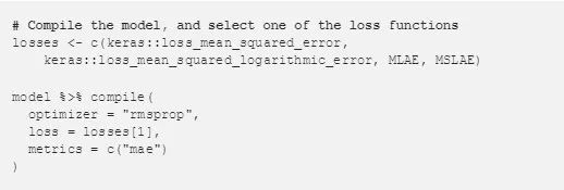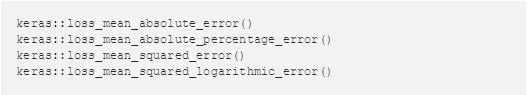 Keras中包含许多用于训练深度学习模型的有用损失函数。例如: mean_absolute_error() 就适用于数值在某种程度上相等的数据集。还有一些函数可能更适合转换后的住房数据,例如:mean_squared_logarithmic_error() 。 下面是由R为Keras提供的损失函数接口: