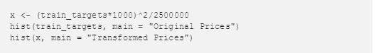 对于如何将价格进行转换,我将标签转换成绝对价格,将结果平方,然后除以大的因子。这产生了一个数据集,其中最高价格和最低价格之间的差异不是 10 倍而是 100 倍。我们现在有一个可以从使用自定义损失函数中获益的预测问题。生成这些图的 R 代码如下所示。