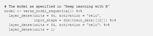 接下来,我们将创建一个 Keras 模型来预测房价。我使用了「Deep Learning with R」中示例的网络结构。该网络包括两层全连接层及其激励函数 relu,以及一个没有变换的输出层。