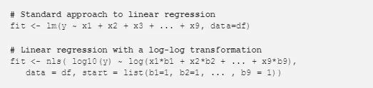 实际上,你可以在 R 中使用非线性最小二乘法(nls)等软件包明确地做到这一点。上面的代码示例演示了如何使用内置优化器来构建线性回归模型,该优化器将使用大标签值对样本进行超重,并介绍如何对预测值和标签执行对数转换的 nls 方法,这将会给样品比较相等的重量。第二种方法的问题是,你必须明确说明如何使用模型中的特征,从而产生特征工程问题。这种方法的另一个问题是,它不能直接应用于其他算法,如随机森林,而无需编写自己的似然函数和优化器。这是针对特定的场景,您希望将错误术语放在日志转换之外,而不是只需将日志转换应用于标签和所有输入变量的场景。