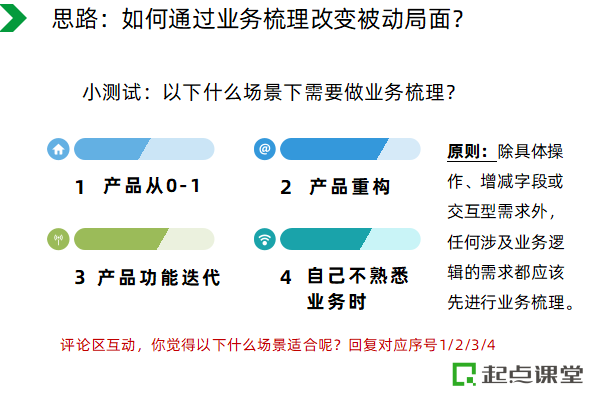 这部分内容,老师将具体讲解需要做业务梳理的四种场景:产品从0-1、产品重构、产品功能迭代升级、产品经理自己不熟悉业务时