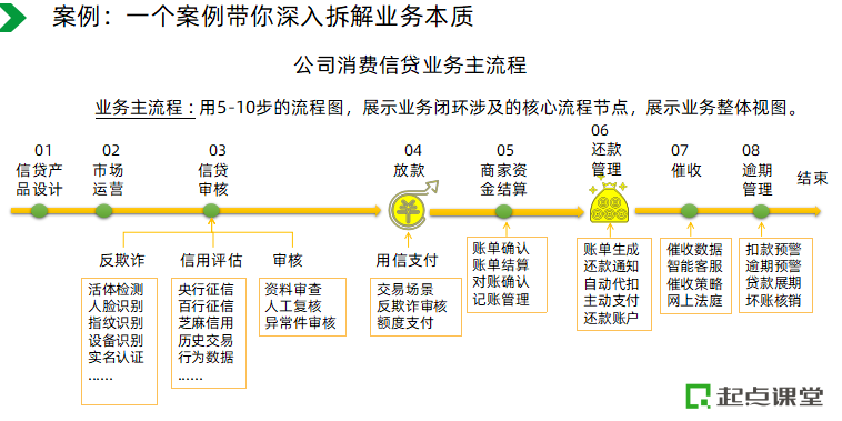 这部分内容,老师将基于第三个部分所讲的方法,用一个具体的场景案例将五级流程的梳理逐级分解演示!