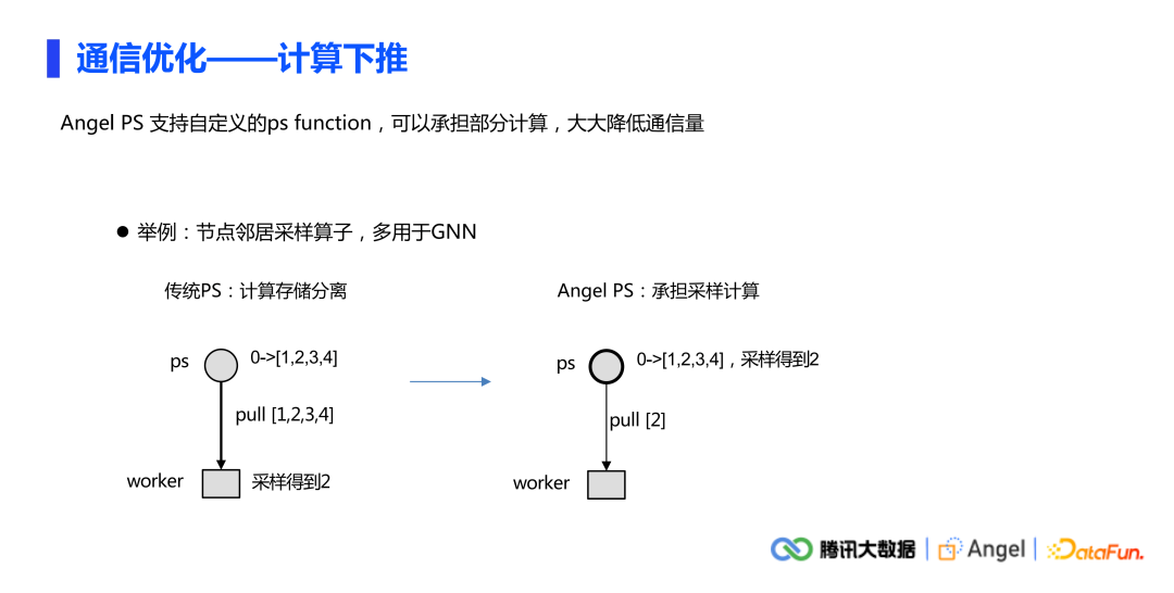 另外一个问题是通信的量比较大,通讯的数据比较多。Angel PS支持自定义PS function功能。Angel PS与传统PS的区别在于它可以做计算,计算的逻辑是由用户自定义的。对于经常要做邻居节点采样的情况,传统PS计算与存储完全分离,在对一个节点做采样时,例如上图左边的情况,worker端从PS把全部邻居拉下来(拉的是1234所有的邻居),然后在下边做采样(得到2)。但是如果PS可以承担部分计算,把采样的功能放在PS上面去做,这样拉的数据就只有2了。整体来看,把通讯的数据大小从边的量级降到了点的量级。