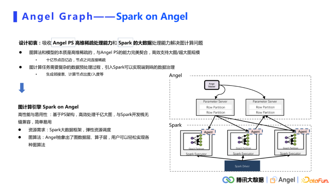Sparkon Angel是一个基于PS结构的高性能图计算引擎。其架构如上图所示,上面是angel,下面是spark。Spark负责分布式计算,Angel负责存储图模型,主要做内容的随机读取和访问。