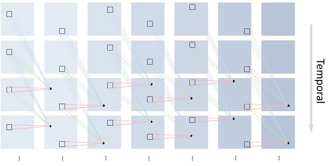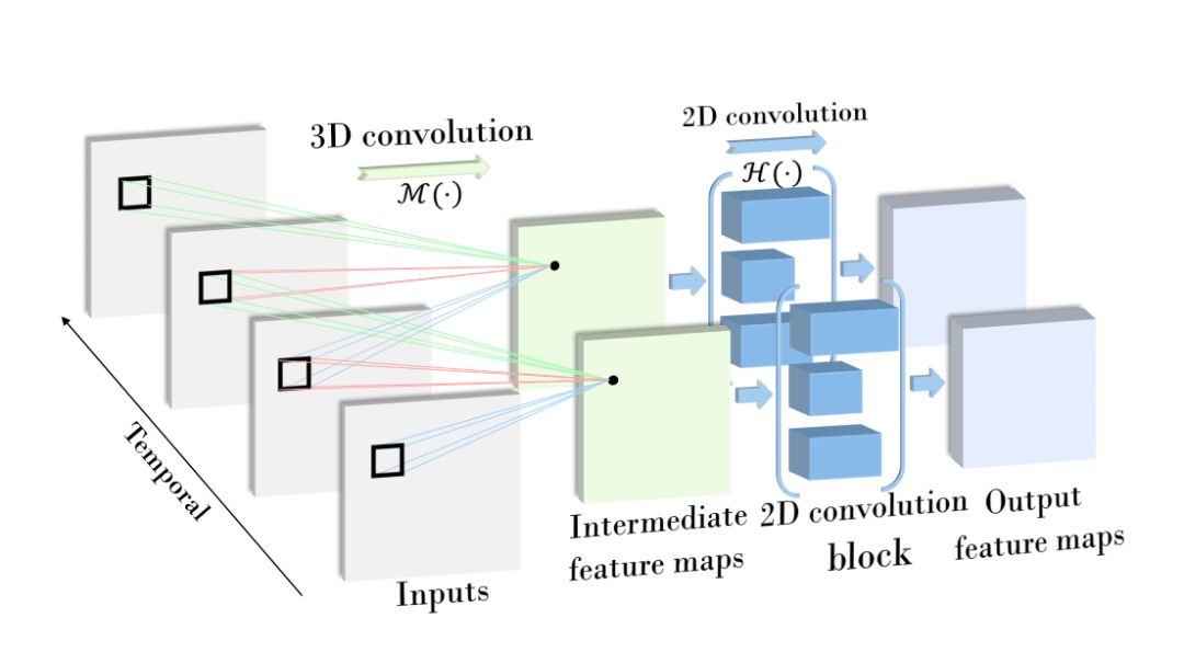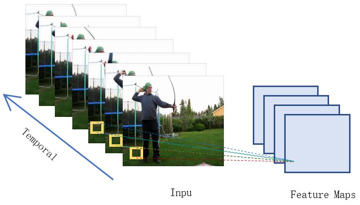 图4:3D卷积特征示例。卷积内核沿3D输入信号的空间和时间维度并生成3D时空特征图。