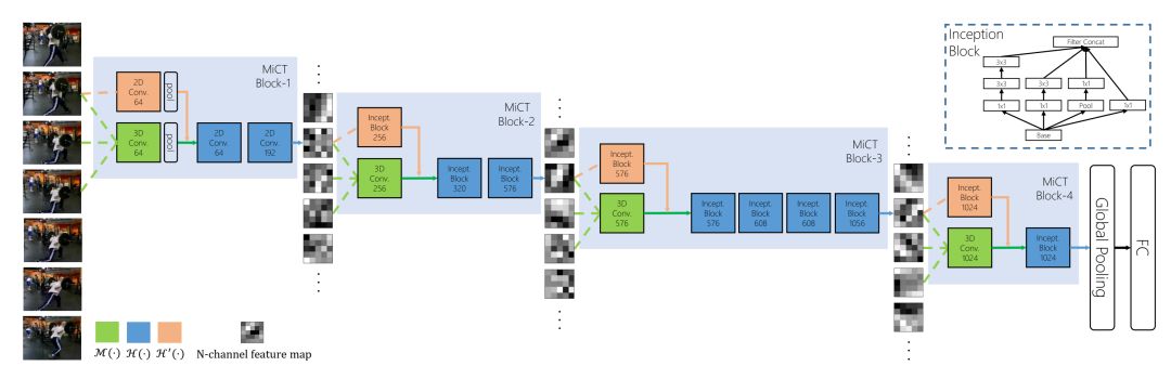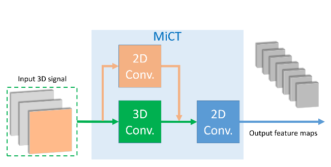 我们在CVPR 2018上发表的MiCT: Mixed 3D/2D Convolutional Tube for Human Action Recognition论文中,提出了一个简单而高效的模块——3D/2D混合卷积模块(MiCT),来处理视频数据,尝试解决这一挑战。