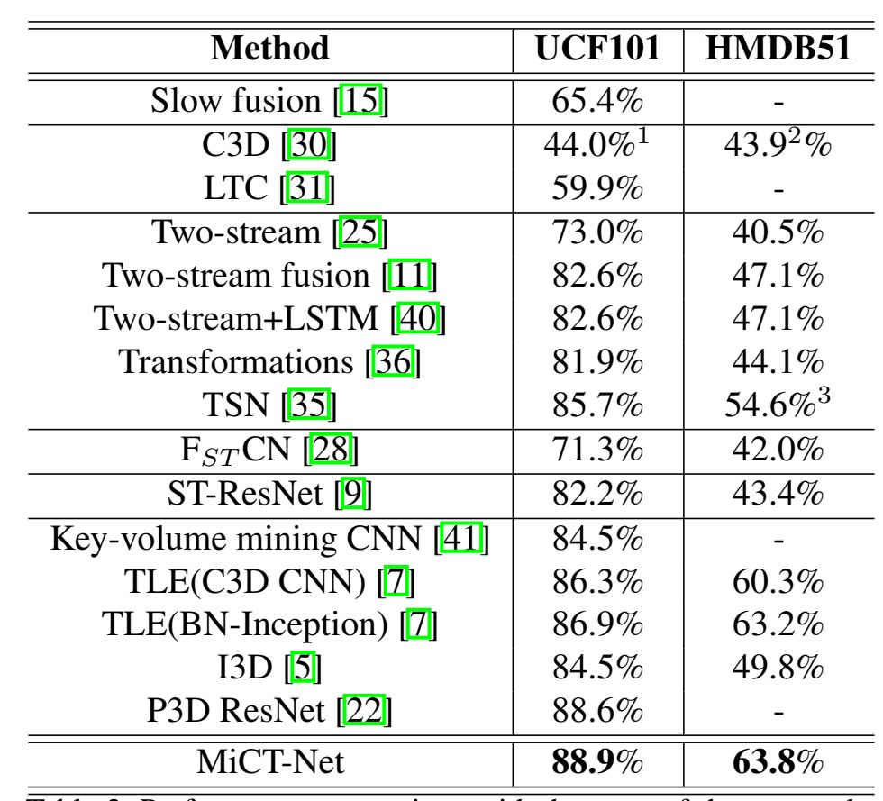 为了验证MiCT-Net的性能,我们使用了三个行为识别的公共数据集(UCF101、Sport-1M和HMDB-51)来进行测试。和基础网络C3D相比,MiCT-Net取得了全方面的提升。如表2所示,MiCT-Net以更小的模型、更快的速度实现了更高的准确性。