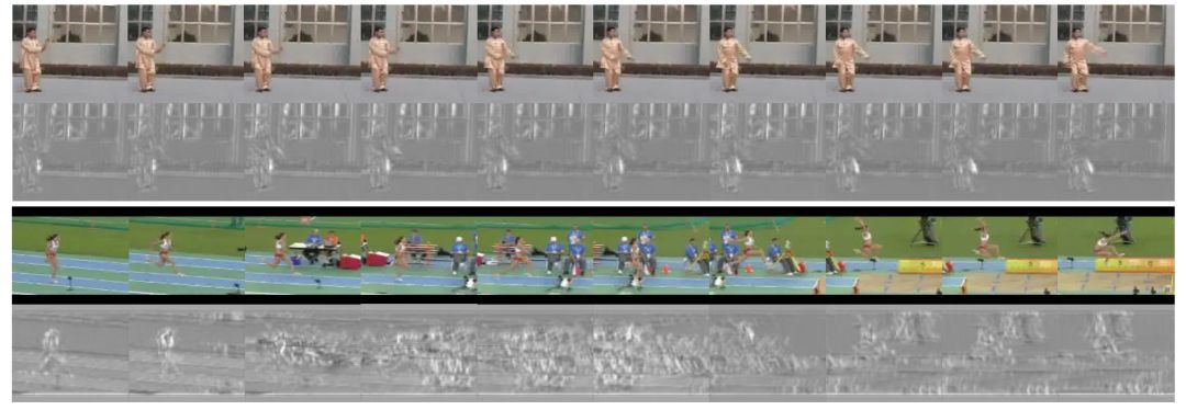 此外,我们也对MiCT-Net所学的特征图进行了可视化,如图10所示。上面的示例是一个慢动作太极视频,MiCT-Net学到的特征信息强调了背景及人体信息,对于慢动作的识别提供了有效的信息;而在下面的相对激烈的跳远视频中,MiCT-Net学到的特征信息更多的集中在运动区域。可见,我们提出的MiCT-Net能够很好地适应视频内容,学到有效的时空特征。