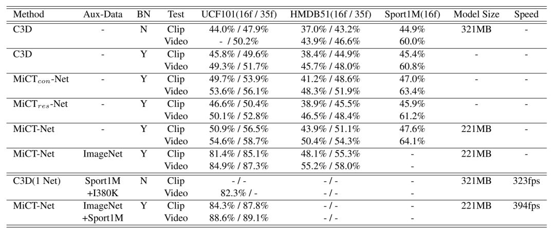同基础网络C3D相比,MiCT-Net包含较少的用于时空融合的3D卷积,但是产生了更深的特征图,同时有效地控制了整个深度模型的复杂性。此外,与传统的3D CNN不同,我们的框架能够利用在大型图像数据集上预训练的2D模型。大图像数据集上预先训练的参数有可能为MiCT中的2D卷积模块提供更好的初始化。