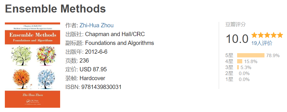 由于《Ensemble Methods》在国内非常难买到,本书在豆瓣读书上的参评人数不多,但一小部分有机会读过原著的同学硬生生把分数给到了逆天的10分满星!但是买不到书对于很多读者来说无疑都是一种遗憾。