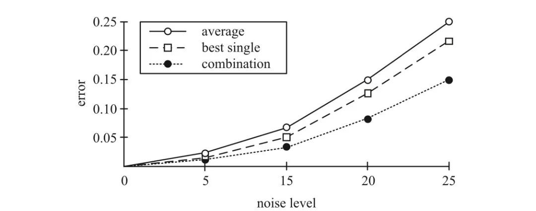 集成通常比最优个体学习器更准确,其中横坐标为噪声水平(noise level),纵坐标为分类错误率(error),三种对比方法分别为平均法(average)、最优个体法(best single)和结合方法(combination)[Hansen & Salamon,1990]