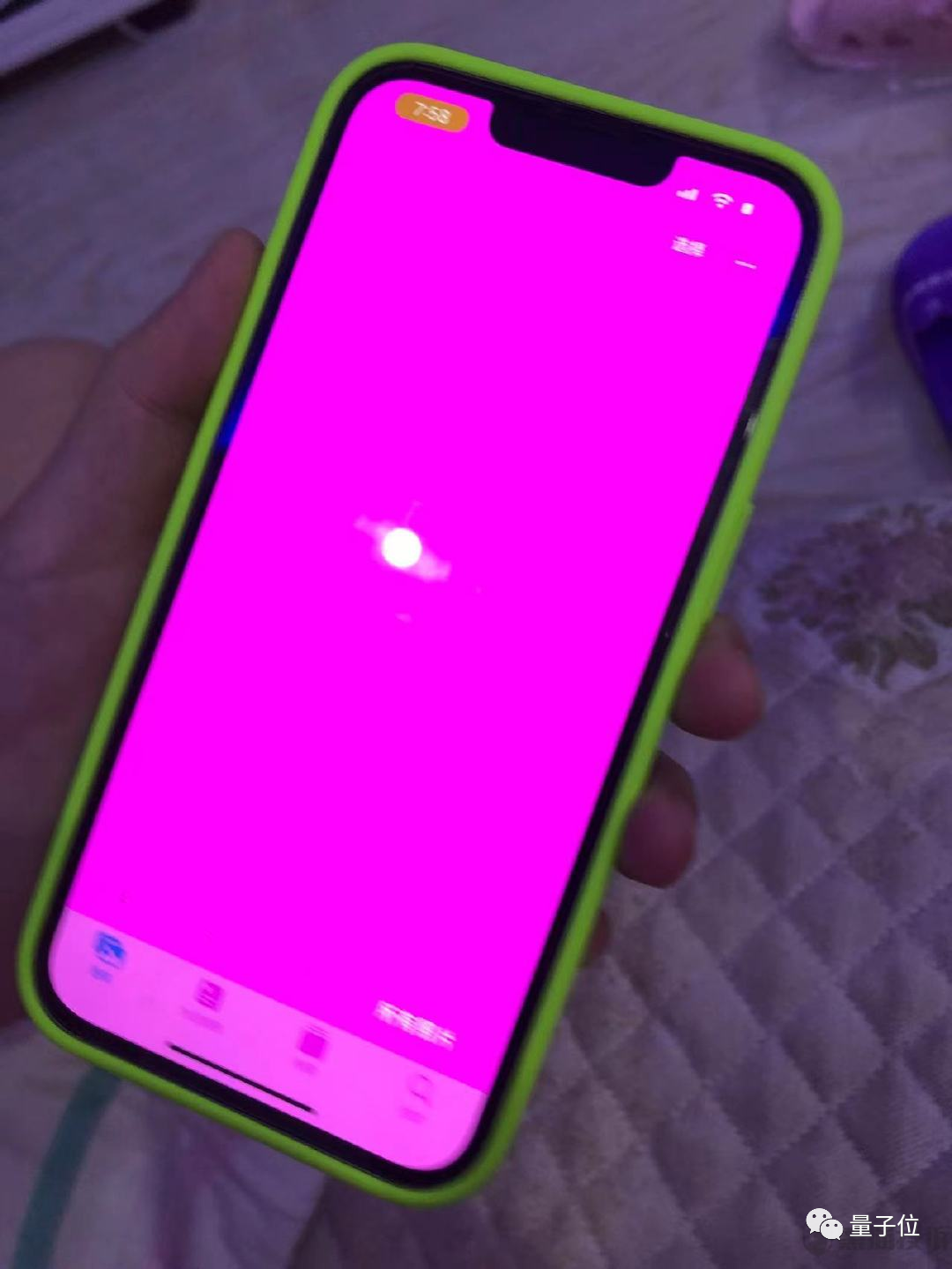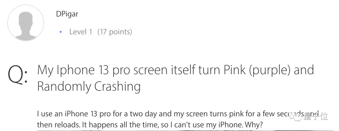 从他反馈的图片中可以看出,屏幕变成了粉紫色,还带渐变色和白块,和国内用户投诉的问题如出一辙: