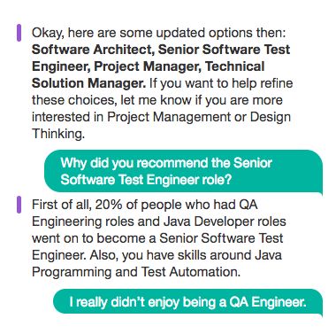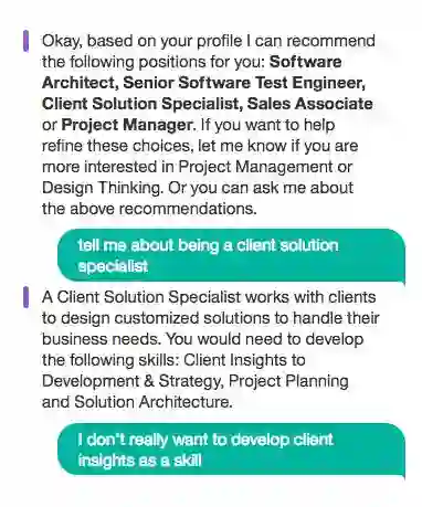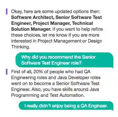 IBM 的 ICGR 框架采用两种方式来解决这个问题。首先,它允许用户浏览推荐结果并查看系统这样推荐的原因。通过这种方式,用户可以理解推荐系统为什么会推荐这样的职业目标,并且当他们发现系统基于他们的兴趣做出了任何错误的设想时,可以向系统提供反馈。例如,系统推荐一个高级测试架构师岗位的解释可能是「75% 的 QA 工程师都会发展为一位高级测试架构师」。QA 工程师的岗位实际上可能就是用户个人档案中的一部分,但是如果用户并不喜欢这个岗位时,他(或她)就通过与推荐系统进行对话告知它这件事情,推荐系统就会降低 QA 工程师这一岗位对于未来职业推荐的影响。