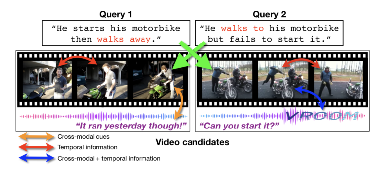 进行视频文本检索的关键是学习精确的视频-文本表示,并建立相似度估计。目前的方法主要存在两个方面的缺陷:1)没有充分利用好视频中动作、音频、语音等各个模态,从上图中可以看出,从所有组成模态中联合提取的线索比单独处理每个模态更具信息性;2)没有充分考虑视频的时间性,由于数据集中的视频时长不一样,目前的方法通常是通过聚合视频中不同时刻提取的描述,从而丢弃长期时间信息。
