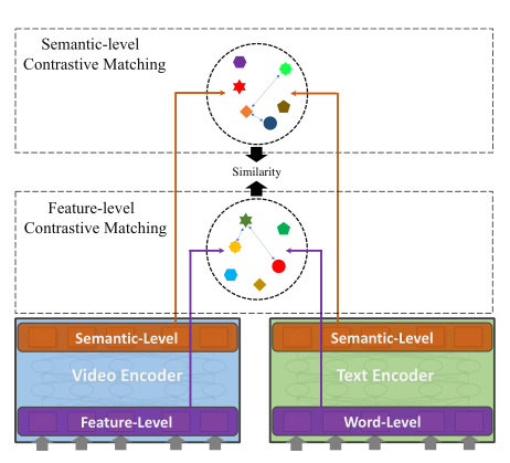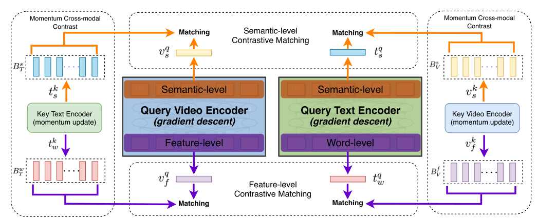 目前的跨模态 Transformer 存在两个方面的局限性:第一,Transformer 中不同层的特征没有得到充分的挖掘;第二,端到端的训练机制限制了负样本的数量,从而影响了最终的性能。因此,在本文中,作者用了对比学习的思想,将底层和高层的视觉-文本特征进行对比,为了获得更多的对比样本,作者也创建了四个内存库,分别存储用于 key 和 query 的文本,视频负样本列表。