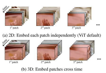 上图展示了本文的模型框架,作者将视频看做一系列图片的集合。对于视频编码,作者采用了 CLIP 中预训练的 ViT,Patch Embedding 的时候采用了以下两种方式(2D:不考虑时间的信息,对每一张图像分别 embedding;3D:考虑时间信息,相邻的帧一起 embedding):