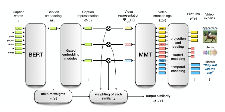 与上一篇文章一样,用预训练的 BERT 提取文本特征,用不同预训练的“专家”模型提取视频中不同模态的特征,不同模态的特征进一步用 Self-Attention 进行加强。
