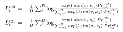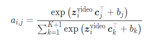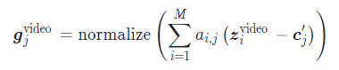 对于局部对齐,作者首先设置了 K+1 个共享聚类中心 c(由于视频和文本共享相同的聚类中心,因此有利于将视频和文本在相同的语义空间中进行对齐),然后根据计算每个聚类中心和每个特征之间的相似性,进行并更新特征,视频更新方式如下所示(文本特征更新方式类似):