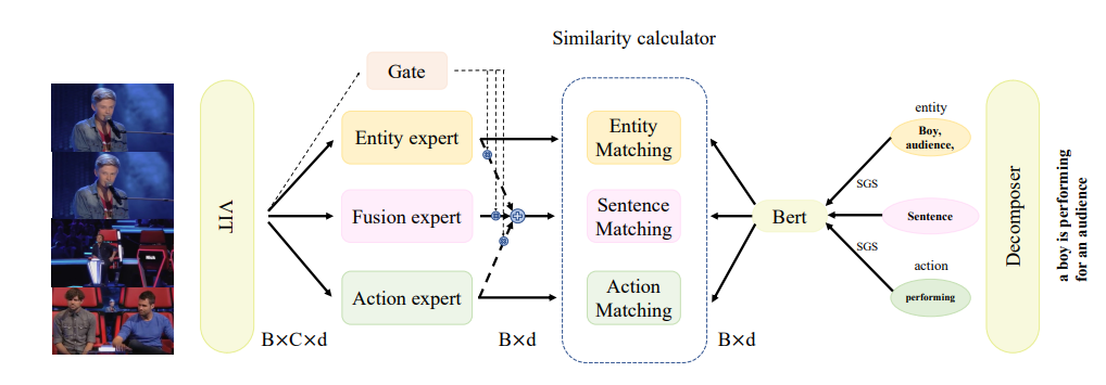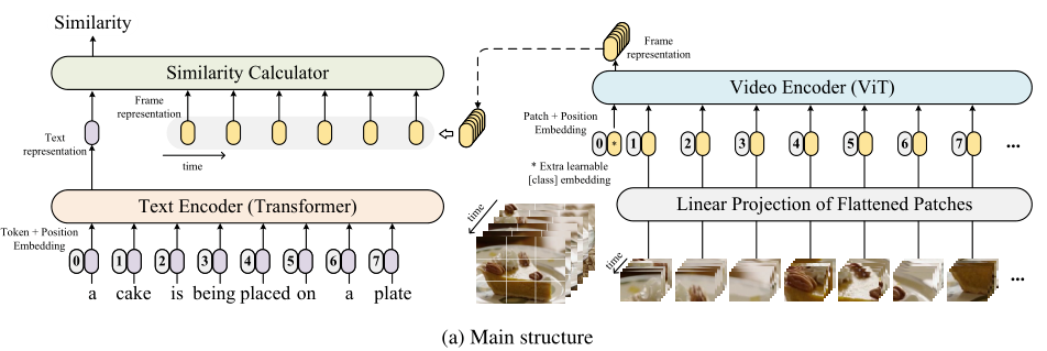 上图展示了本文的 overview,视频(帧)和文本的特征分别通过 CLIP 中预训练的 ViT 和 BERT 进行提取,注意,这里作者将视频和文本的特征分成了三个部分,三个部分分别计算相似度。