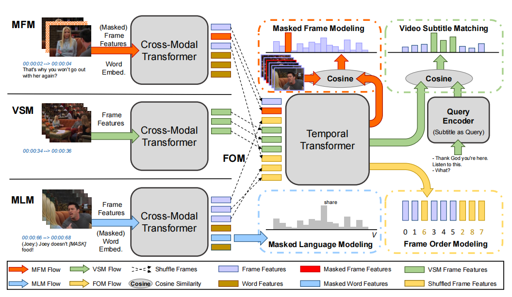 本文的框架如上图所示,首先用跨模态 Transformer 来对每个视频帧和对应的字幕进行编码,然后再用时间 Transformer,对视频帧之间的时间信息进行建模。最后基于Masked Language Modeling、Masked Frame Modeling、Video-Subtitle Matching 和 Frame Order Modeling 四个预训练任务进行训练,以获得视频和文本表示。