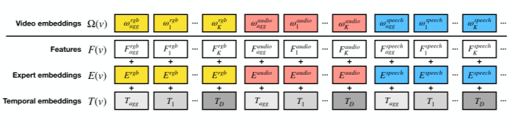 本文的结构如上图所示,本文的特征提取用的是预训练的 BERT,视频的特征用的是不同的预训练好的“专家”模型来提取不同模态的特征,每个模态采用 max-pooling获得一个聚合特征,然后将提取的特征和专家 embedding、时间 embedding 相加能到最终的视频特征(如下图所示)。