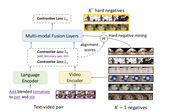 如上图所示,本文的方法有三个损失函数:L1 是句子级别的对比损失,L2 是 token 级别的对比损失,L3 是融合之后的对比损失。对于 token 级别的损失函数,作者采用了名词和动态和所有帧进行对比,因为作者通过实验发现,这样的效果最好。另外,如果对所有负样本在多模态融合层进行融合的话,就会导致太大的计算量。因此,作者提出了使用 L1 和 L2 中计算的相似度来进行负样本的级联采样。