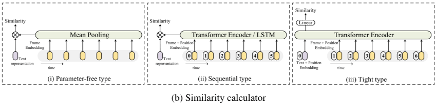 这样,我们就获得了带时间序列信息的视频表示和文本表示,然后作者采用了三种方式进行了视频和文本的相似度计算,如上图所示,总的来说前两种的方法的性能要由于第三种方法,可能是因为第三种方法引入了太多随机初始化的参数,从而破坏了原来 CLIP 已经学好的信息。